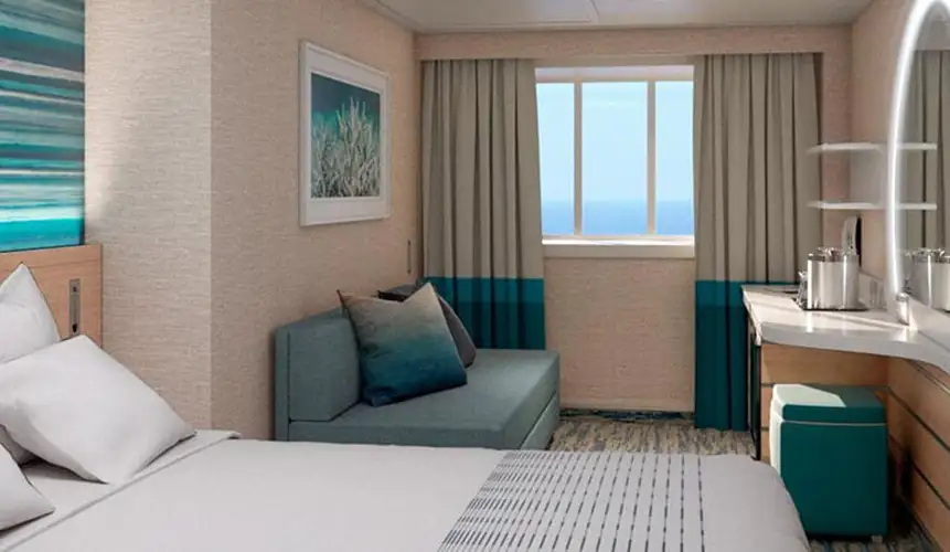 Votre cabine Ocean View avec grande fenêtre panoramique offre une magnifique vue et une belle luminosité naturelle, pour un séjour encore plus agréable. (Remarque : la vue peut être partiellement obstruée.)
